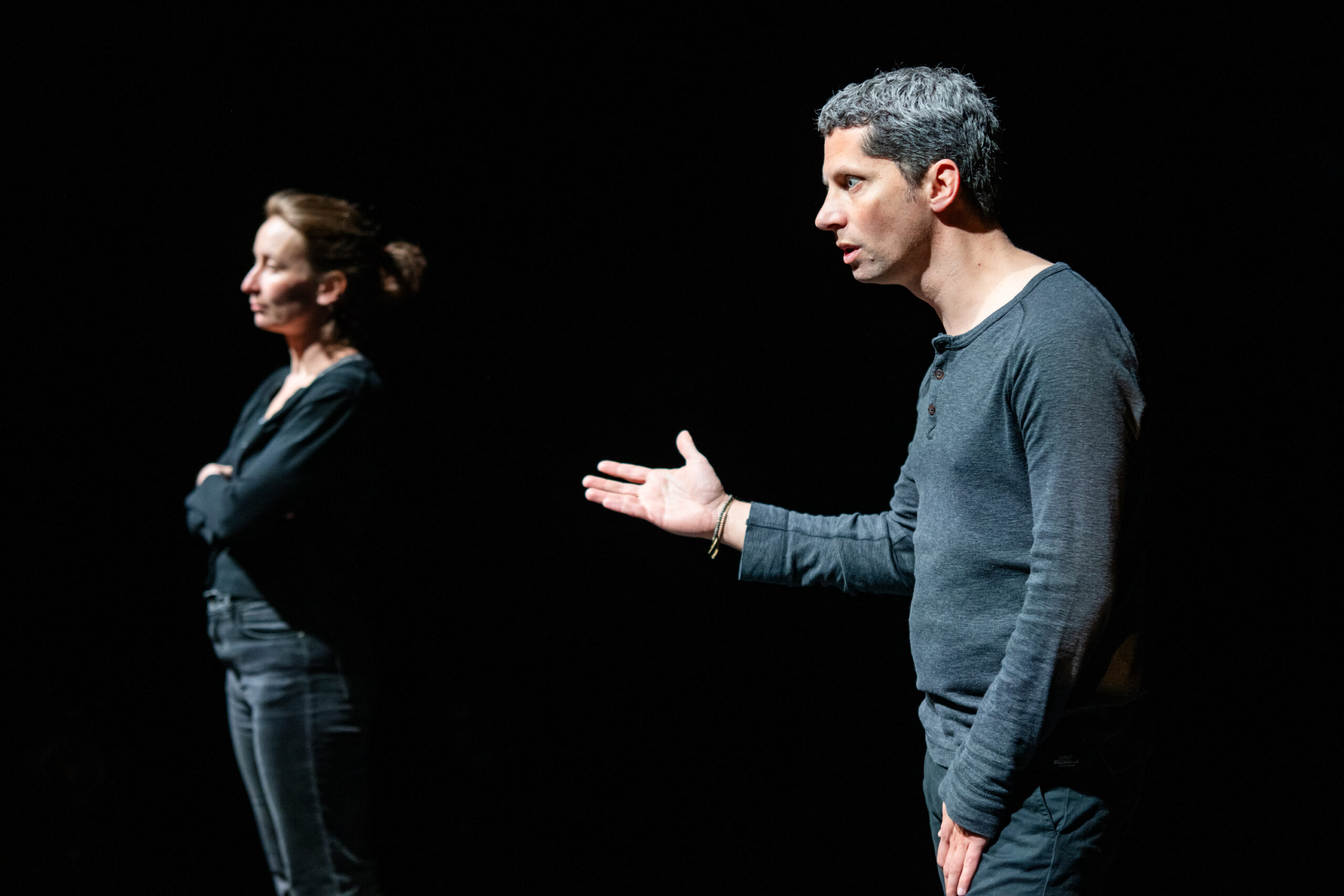 Il y a elle, il y a lui. Et il y a le monde autour en train de changer. À travers les fragments de leur vie à deux, la compagnie nous propose une géographie sensible du couple d’aujourd’hui. Les points de focus sur leur histoire sont multiples, réinterrogeant leur vécu, les points de vue, la réalité de ces moments, leurs alternatives, réinventant les possibles. Dans cette création en cours qui interroge le couple dans le post-MeToo, il est autant question de dissection des rapports que de sensible, entremêlant théâtre et danse, passant en permanence de leur histoire, de leur intimité, à ce que nous traversons toutes et tous aujourd'hui, avec l'envie certaine de continuer à tenter quelque chose.